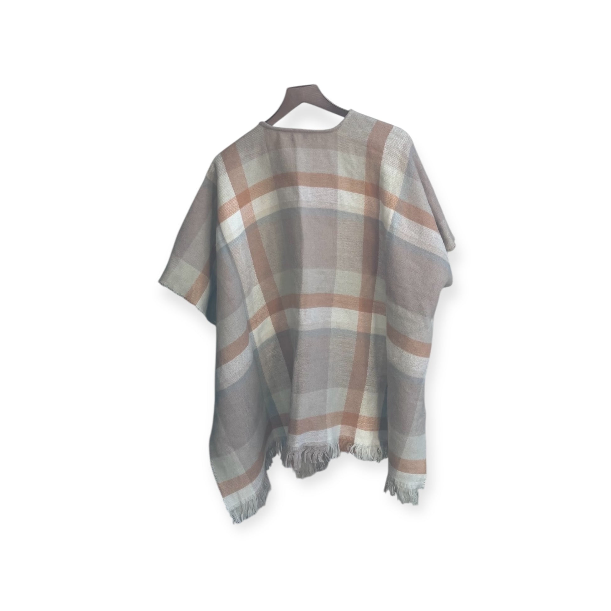 Women's vintage plaid poncho wrap with a toggle closure and frayed hem